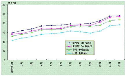 我国原油价格已与国际市场接轨,轻质油、中质油I、中质油II和重质油的接轨油分别是塔皮斯、米纳斯、辛塔和杜里油。2007年这4种原油与其他原油一样波动上涨,使国内原油基准价也屡创历史新高,见下图。